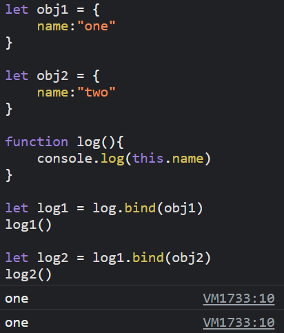 - log1 函式已經綁定過 obj1 了,再次綁定 obj2 會沒有效果,log1 的 this 依然是 obj1