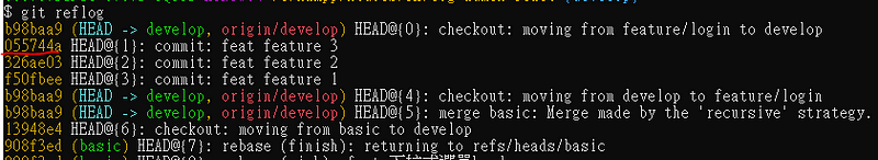 執行 git reflog 指令之後,會看到密密麻麻的 commit 紀錄,找出剛剛被刪掉的分支最後一個 commit 點在哪,並且記下最前面的 SHA-1 值
