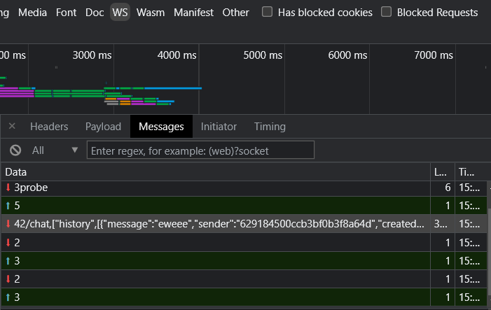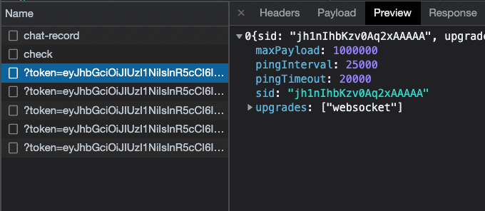 打開網頁測試,觀察 DevTools 的 network,發現 socket.io 戳了好幾次 api,說好的 webSocket 呢?先別緊張,當連接成功時 socket.io 會先使用 long polling 的方式,確認網頁能夠支援 websocket 之後,再使用 websocket 連接
