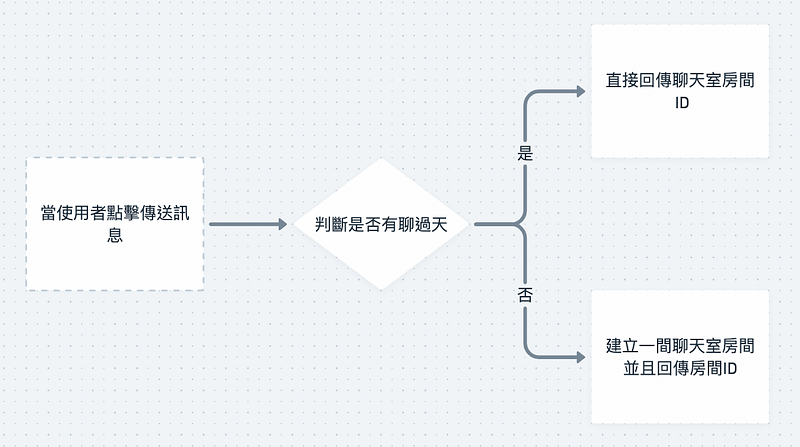 由於創建房間這段的程式沒有使用到 socket.io,因此這段的流程會用流程圖簡單帶過,當使用者 A 想要傳送訊息給使用者 B 的時候,會先檢查使用者 A 的聊天紀錄是否曾經和使用者 B 聊過天,如果有找到跟 B 聊天的房間 ID,就直接回傳該房間 ID,沒有的話代表從未聊過天,會在 room 的資料表建立一間新的房間,並且將房間 ID 存放在使用者 A 和使用者 B 的聊天紀錄當中