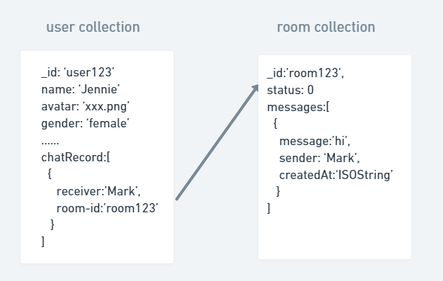 為了實現聊天記錄的功能,每個使用者身上都會存放一個聊天記錄的陣列(chatRecord),這邊的聊天記錄指的並非對話紀錄,而是指使用者曾經和誰聊過天的紀錄,chatRecord 會存聊天對象的 userId 和聊天室的房間 Id