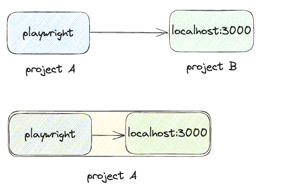 - 自己先在 project B 手動起一個 localhost:3000,然後在 project A 的 playwright 的 baseURL 設定為 localhost:3000,讓 playwright 針對這個 localhost:3000 做測試