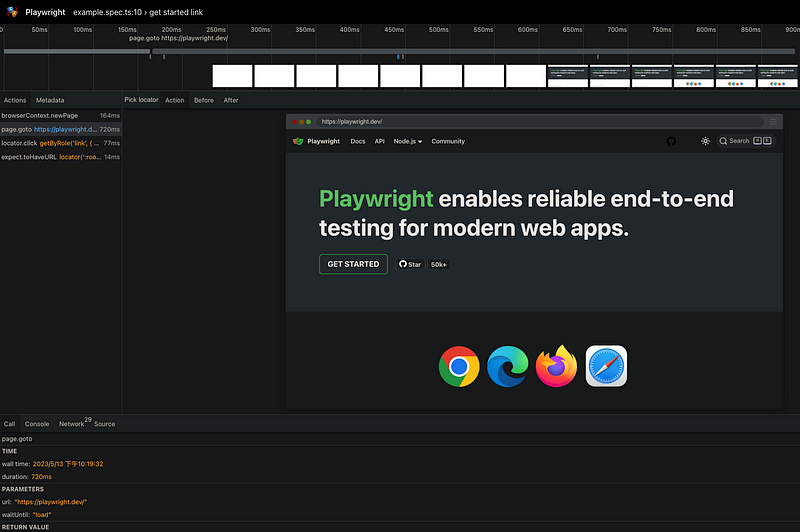 playwright 提供了 ui 介面方便使用者查看每個測試階段,左邊會列出測試步驟,上方則會有逐格的畫面錄製,可以觀察每個畫面的變化,下方的面板有 console、network 等等的資訊,讓開發者更容易除錯