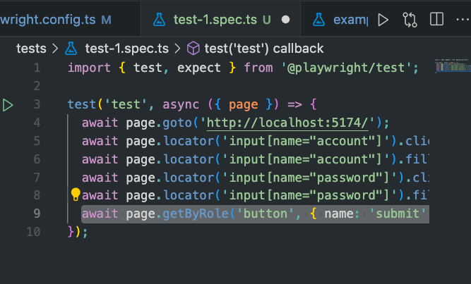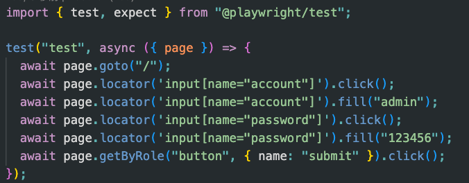 操作完畢後,回到 vscode 看會發現 playwright 已經幫你寫好了所有的步驟,完全不用親自動手,不過實務上還是會做微調,不然就會出現很多不必要的語法,像是 input click 這個動作其實是不需要的,只是因為我們在輸入之前要先選到那個輸入框,因此是可以被移除,只要留下 fill 和 click button 的語法即可