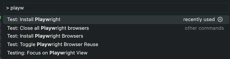 假如先前已經安裝好 playwright vscode 套件,可以按 ctrl(cmd) + shift + p,呼叫執行指令的輸入框,輸入 playwright 後選擇 install playwright