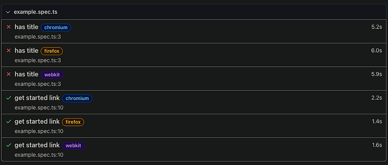 會依照 test case 和瀏覽器逐一生成測試報告,讓測試結果一目瞭然,後方也會列出執行秒數