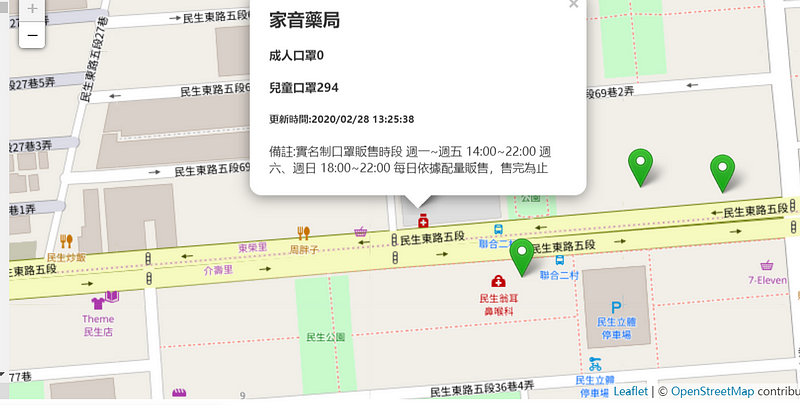 this.dataList[‘features’].forEach((item) => { let [x, y] = item.geometry.coordinates let { name, updated, custom_note, mask_adult, mask_child } = item.properties let marks = item.properties.mask_adult == 0 ? this.redMark : this.greenMark this.markLayer.addLayer(L.marker([y, x], { icon: marks }).bindPopup(`<h2>${name}</h2> <h4>成人口罩${mask_adult}</h4><h4>兒童口罩${mask_child}</h4><h5>更新時間:${updated}</h5><p>備註:${custom_note}</p> `)) }) this.map.addLayer(this.markLayer) }