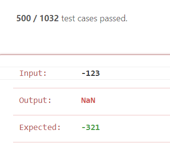 這時候題目就會開始跑很多 test case,以下面那題的例子來說,有 1032 個 test case,如果有些 edge case 沒考慮到的話,你的程式碼可能就爆掉了,不會通過測試,接著就會看到下面這樣的訊息,輸入-123 預期要輸出-321,結果卻是輸出 NaN。