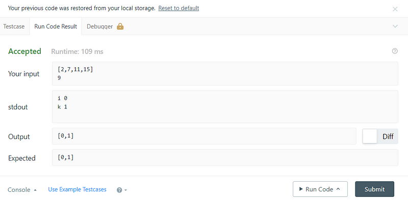 作答完之後,可以按右下角的 Run Code 來看第一次 test case 看有沒有通過,如果有通過,覺得自己寫的差不多了,就可以按下 Submit 了。