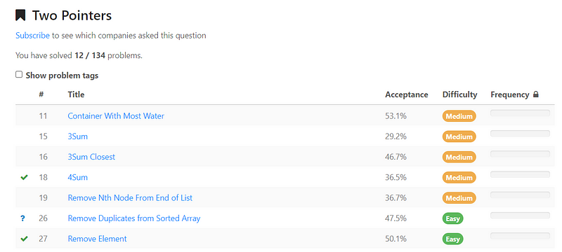 如果想練習特定類型的題目,可以直接點選該分類,就會看到所有相關的題目囉!像是雙指針 Two Pointers