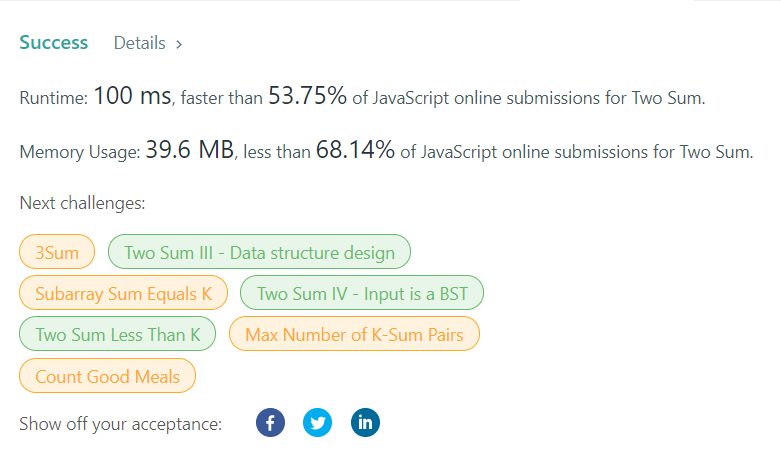 假如我們成功通過了所有的 test case,恭喜你! 就會看到 Success 的畫面,告訴你程式的執行時間和執行效率跟其它提交者相比快了多少,以及記憶體的用量狀況,下面的 next challenges 則是推薦相關或是相似的題目給你。