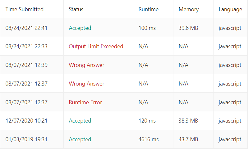 - Output Limit Exceeded:超過輸出長度,提交前記得要把 console.log 註解或是拔掉,不然就會看到這個錯誤訊息了