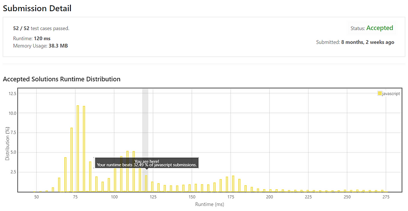 上面表格裡的 status 都可以點擊,就會看到每個提交答案執行時間的分布,看你落在哪個區間,有 PR 值的既視感。