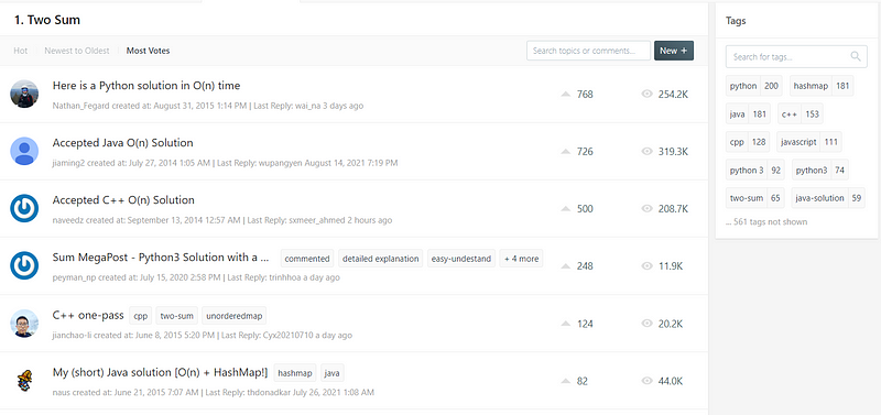 不過有些題目真的是想破頭都不知道怎麼解阿! 不是付費會員又不能看 solution,該如何是好呢?之前都會 Google leetcode xxx answer 看別人的解法,其實根本不用這麼麻煩,可以去點擊左上角頁籤的 discuss,裡面有很多人分享自己的解法。