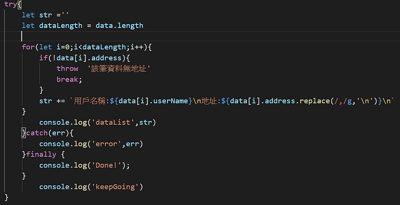 這時就可以用 try catch 來預防這樣的情況,try 區塊放的程式碼是你預期可能會出錯的地方,可以針對不同的狀況,用 throw 拋出不同的錯誤訊息,如果在執行時發生錯誤就會拋出錯誤給 catch 並且印出錯誤訊息,補充一下無論是否在 try 的部分拋出錯誤, finally 都會執行。